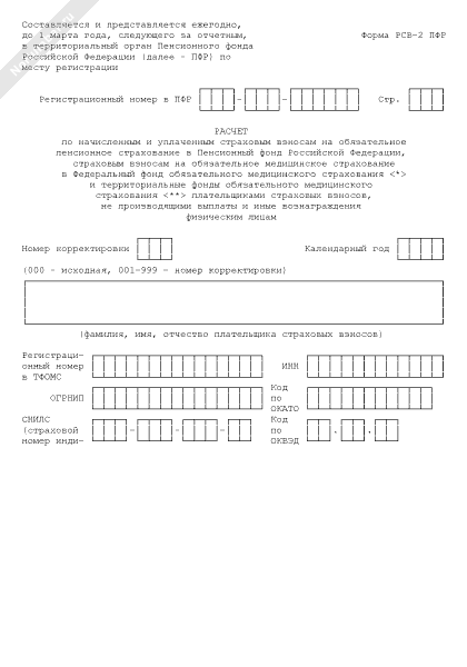 - 621Расчет по начисленным и уплаченным страховым взносам на обязательное пенсионное страхование в Пенсионный фонд Российской Федерации, страховым взносам на обязательное медицинское страхование в Федеральный фонд обязательного медицинского страхования и территориальные фонды обязательного медицинского страхования плательщиками страховых взносов, не производящими выплаты и иные вознаграждения физическим лицам. Форма РСВ-2 ПФР