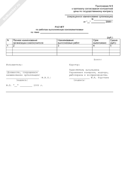 - 629Расчет по работам выполняемым соисполнителями (приложение к протоколу согласования контрактной цены по государственному контракту на выполнение в 2009 году научно-исследовательских и опытно-конструкторских работ по направлению «Научное обеспечение мероприятий по разработке нормативов расходов на осуществление мероприятий по охране водных биоресурсов и среды их обитания, искусственному воспроизводству водных биоресурсов, акклиматизации и рыбохозяйственной мелиорации» для нужд Федерального агентства по рыболовству)