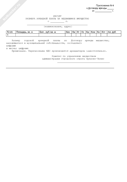 - 764Расчет размера арендной платы за недвижимое имущество (приложение к договору аренды на имущество, находящееся в муниципальной казне городского округа Орехово-Зуево Московской области)