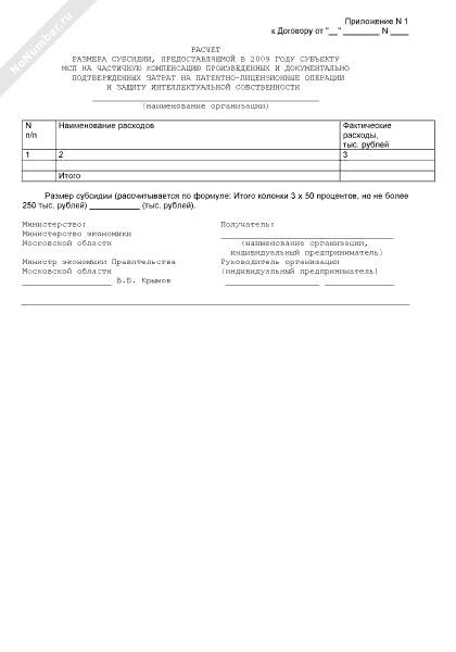 - 762Расчет размера субсидии, предоставляемой в 2009 году субъекту малого и среднего предпринимательства на частичную компенсацию произведенных и документально подтвержденных затрат на патентно-лицензионные операции и защиту интеллектуальной собственности (приложение к договору на выполнение мероприятий долгосрочной целевой программы Московской области «Развитие субъектов малого и среднего предпринимательства в Московской области на 2009-2012 годы»)