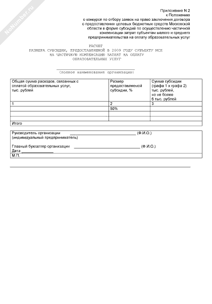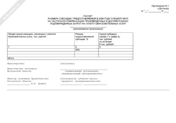 - 772Расчет размера субсидии, предоставляемой в 2009 году субъекту МСП на частичную компенсацию произведенных и документально подтвержденных затрат на оплату образовательных услуг (приложение к договору на выполнение мероприятий долгосрочной целевой программы Московской области «Развитие субъектов малого и среднего предпринимательства в Московской области на 2009-2012 годы»)