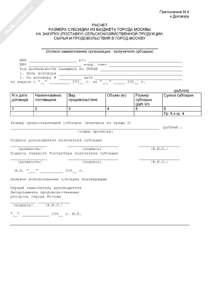 - 777Расчет размера субсидии из бюджета города Москвы на закупку (поставку) сельскохозяйственной продукции, сырья и продовольствия (приложение к договору о предоставлении субсидии из бюджета города Москвы в целях возмещения части затрат в связи с выполнением годовой программы оптовых поставок продовольствия в город Москву)
