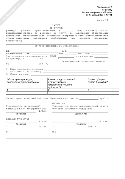 - 791Расчет размера субсидии, предоставляемой субъекту малого предпринимательства по договору на услуги по выполнению обязательных требований законодательства Российской Федерации и (или) законодательства страны-импортера, являющихся необходимыми для экспорта продукции (форма № 10)