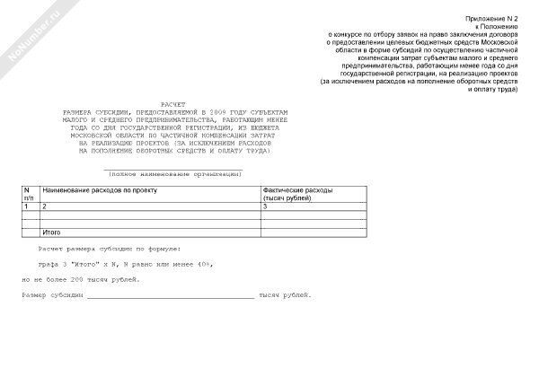 - 798Расчет размера субсидии, предоставляемой в 2009 году субъектам малого и среднего предпринимательства, работающим менее года со дня государственной регистрации, из бюджета Московской области по частичной компенсации затрат на реализацию проектов (за исключением расходов на пополнение оборотных средств и оплату труда)