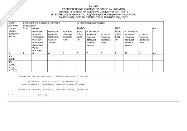 - 855Расчет распределения задания на отбор кандидатов для поступления на военную службу по контракту на воинские должности, подлежащие замещению солдатами, матросами, сержантами и старшинами