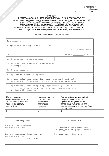 - 845Расчет размера субсидии, предоставляемой в 2010 году субъекту малого и среднего предпринимательства из бюджета Московской области на частичную компенсацию процентных ставок по кредитам, выданным им банками и иными кредитными организациями для приобретения основных и оборотных средств на осуществление предпринимательской деятельности (приложение к договору на выполнение мероприятий долгосрочной целевой программы Московской области «Развитие субъектов малого и среднего предпринимательства в Московской области на 2009-2012 годы»)