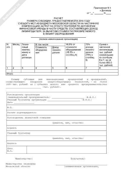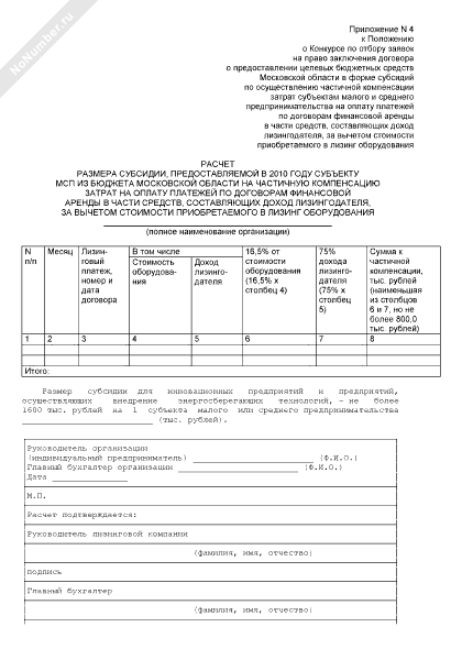 - 847Расчет размера субсидии, предоставляемой в 2010 году субъекту МСП из бюджета Московской области на частичную компенсацию затрат на оплату платежей по договорам финансовой аренды в части средств, составляющих доход лизингодателя, за вычетом стоимости приобретаемого в лизинг оборудования (приложение к договору на выполнение мероприятий долгосрочной целевой программы Московской области «Развитие субъектов малого и среднего предпринимательства в Московской области на 2009-2012 годы»)