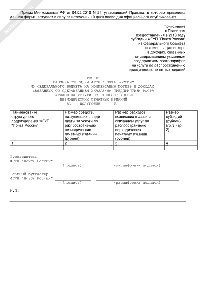 - 851Расчет размера субсидии ФГУП «Почта России» из федерального бюджета на компенсацию потерь в доходах, связанных со сдерживанием указанным предприятием роста тарифов на услуги по распространению периодических печатных изданий за полугодие