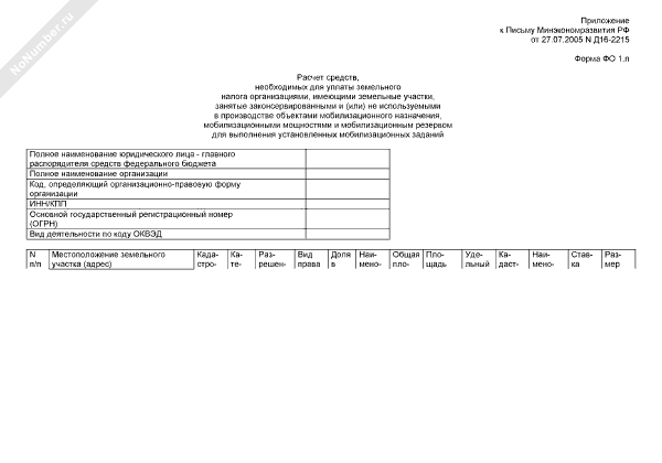 - 962Расчет средств, необходимых для уплаты земельного налога организациями, имеющими земельные участки, занятые законсервированными и (или) не используемыми в производстве объектами мобилизационного назначения, мобилизационными мощностями и мобилизационным резервом для выполнения установленных мобилизационных заданий. Форма № ФО 1.N