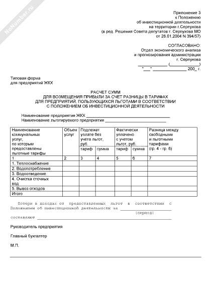 - 1032Расчет сумм для возмещения прибыли за счет разницы в тарифах для предприятий г. Серпухова Московской области, пользующихся льготами в соответствии с положением об инвестиционной деятельности (типовая форма; для предприятий ЖКХ)