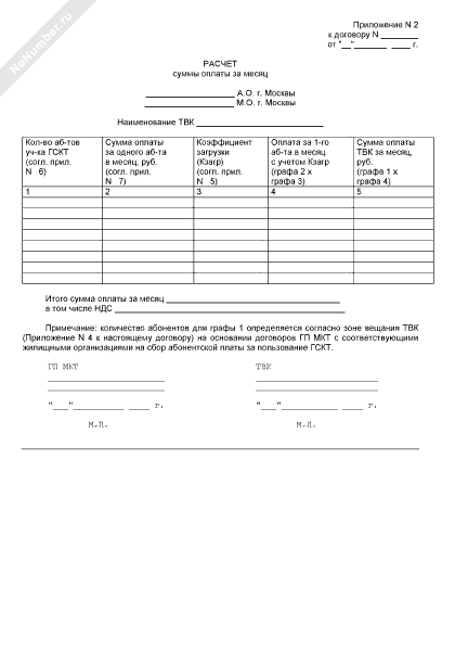 - 1046Расчет суммы оплаты за месяц (приложение к типовому договору на оказание услуг по трансляции телевизионных программ по единому городскому телевизионному каналу в городских сетях кабельного телевидения)