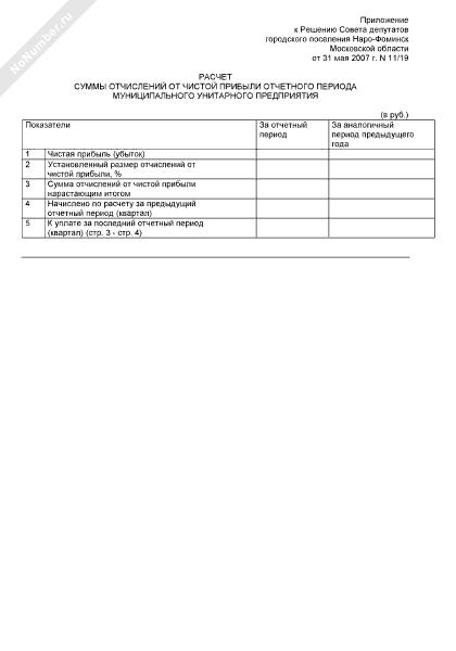 - 1047Расчет суммы отчислений от чистой прибыли отчетного периода муниципального унитарного предприятия городского поселения Наро-Фоминск Московской области