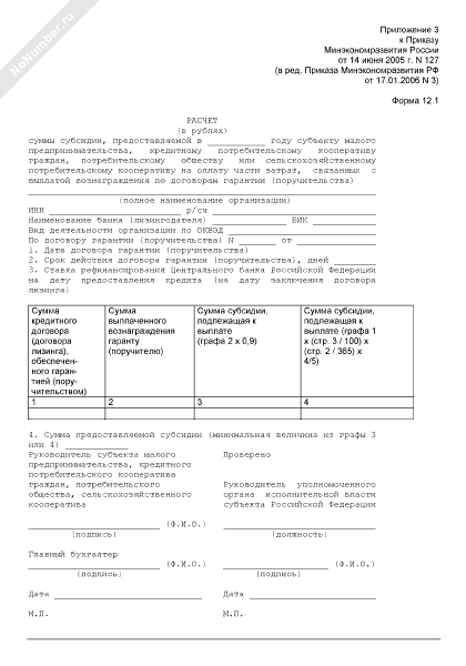 - 1055Расчет суммы субсидии, предоставляемой субъекту малого предпринимательства, кредитному потребительскому кооперативу граждан, потребительскому обществу или сельскохозяйственному потребительскому кооперативу на оплату части затрат, связанных с выплатой вознаграждения по договорам гарантии (поручительства). Форма № 12.1