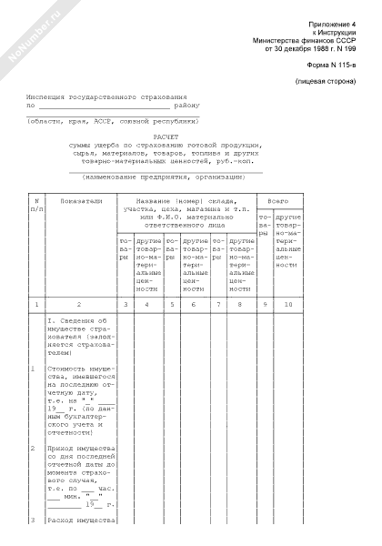 - 1057Расчет суммы ущерба по страхованию готовой продукции, сырья, материалов, товаров, топлива и других товарно-материальных ценностей. Форма № 115-В