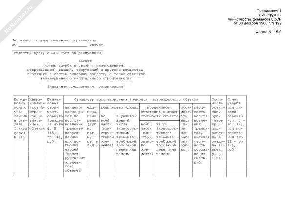 - 1056Расчет суммы ущерба в связи с уничтожением (повреждением) зданий, сооружений и другого имущества, входящего в состав основных средств, а также объектов незавершенного капитального строительства. Форма № 115-Б