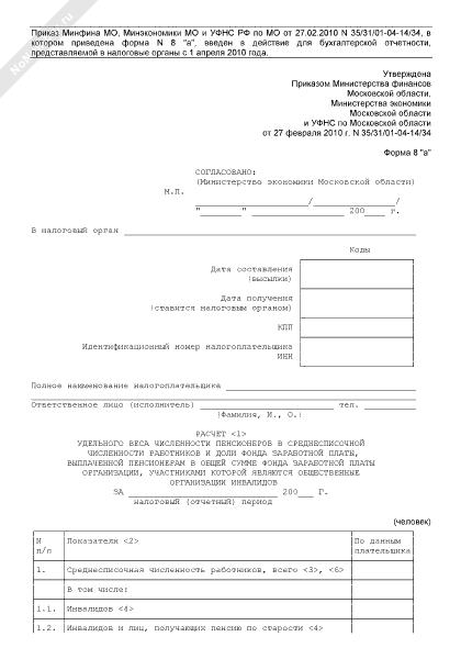 - 1082Расчет удельного веса численности пенсионеров в среднесписочной численности работников и доли фонда заработной платы, выплаченной пенсионерам в общей сумме фонда заработной платы организации, участниками которой являются общественные организации инвалидов Московской области. Форма № 8 «а»