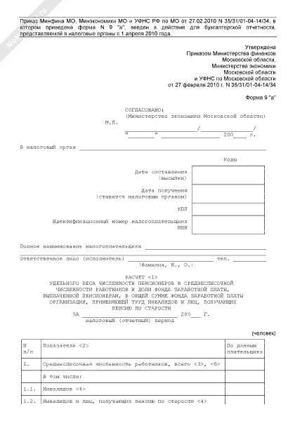 - 1083Расчет удельного веса численности пенсионеров в среднесписочной численности работников и доли фонда заработной платы, выплаченной пенсионерам, в общей сумме фонда заработной платы организации Московской области, применяющей труд инвалидов и лиц, получающих пенсию по старости. Форма № 9 «а»