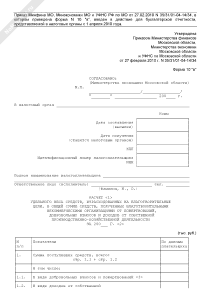 - 1084Расчет удельного веса средств, израсходованных на благотворительные цели, в общей сумме средств, полученных благотворительными некоммерческими организациями Московской области от пожертвований, добровольных взносов и доходов от собственной производственно-хозяйственной деятельности. Форма № 10 «в»