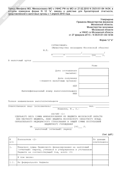 - 1085Расчет удельного веса суммы финансирования из бюджета Московской области или местного бюджета, либо бюджета Московского областного фонда обязательного медицинского страхования в общей сумме поступлений бюджетного учреждения. Форма № 12 «а»