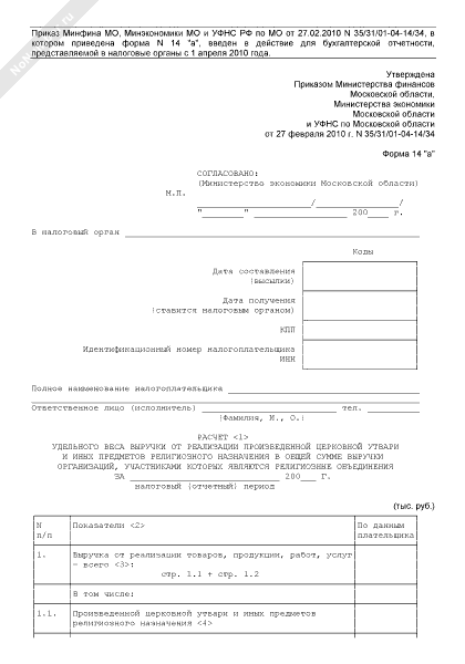 - 1086Расчет удельного веса выручки от реализации произведенной церковной утвари и иных предметов религиозного назначения в общей сумме выручки организаций, участниками которых являются религиозные объединения Московской области. Форма № 14 «а»