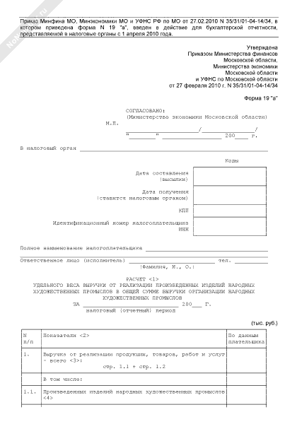 - 1087Расчет удельного веса выручки от реализации произведенных изделий народных художественных промыслов в общей сумме выручки организации народных художественных промыслов в Московской области. Форма № 19 «а»