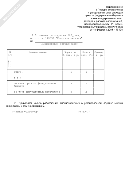 Формы-расшифровки к сметам доходов и расходов организаций, подведомственных Министерству природных ресурсов Российской Федерации. Расчет расходов по статье 110330 «Продукты питания» (рекомендуемый образец заполнения)