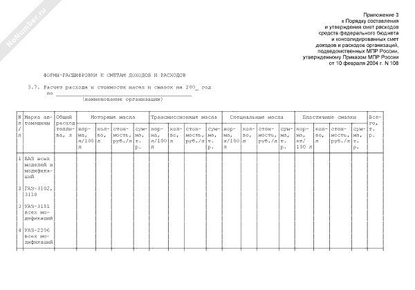 Формы-расшифровки к сметам доходов и расходов организаций, подведомственных Министерству природных ресурсов Российской Федерации. Расчет расхода и стоимости масел и смазок (рекомендуемый образец заполнения)