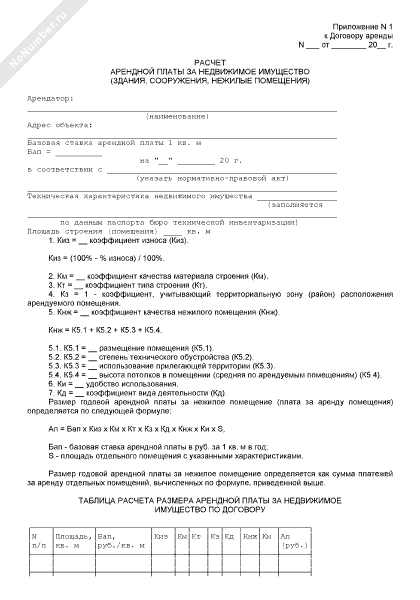 Расчет арендной платы за недвижимое имущество (здания, сооружения, нежилые помещения) (приложение к договору аренды недвижимого имущества, находящегося в муниципальной собственности Рузского района Московской области)
