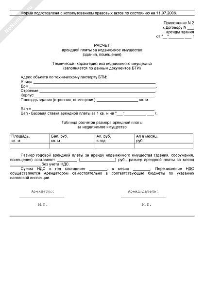 Расчет арендной платы за недвижимое имущество (здания, помещения) (приложение к договору аренды здания)