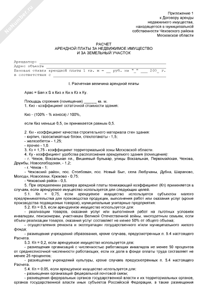 Расчет арендной платы за недвижимое имущество и за земельный участок (приложение к договору аренды недвижимого имущества, находящегося в муниципальной собственности Чеховского района Московской области)