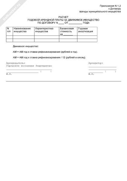 Расчет годовой арендной платы за движимое имущество по договору (приложение к договору аренды муниципального имущества городского поселения Решетниково Московской области)