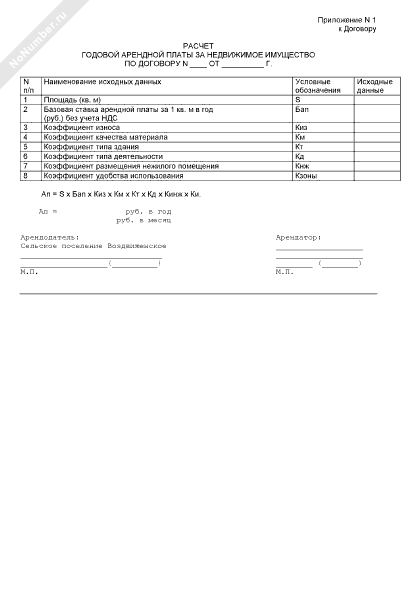 Расчет годовой арендной платы за недвижимое имущество (приложение к договору аренды недвижимого имущества, принадлежащего арендодателю на праве собственности сельского поселения Воздвиженское Клинского района Московской области)