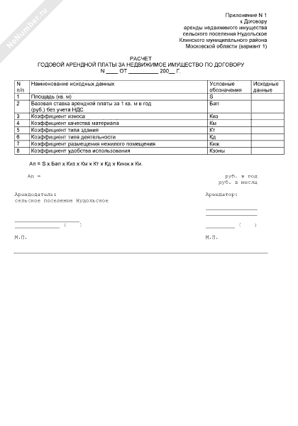 Расчет годовой арендной платы за недвижимое имущество по договору (приложение к договору аренды недвижимого имущества сельского поселения Нудольское Клинского муниципального района Московской области (вариант 1))