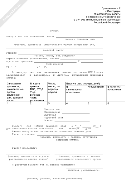 Расчет выслуги лет для назначения пенсии в системе Министерства внутренних дел Российской Федерации (рекомендуемый образец заполнения)