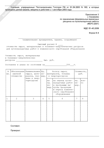 Сметный расчет стоимости сырья, материальных и топливно-энергетических ресурсов для пусконаладочных работ и комплексного опробования оборудования (форма № 4)