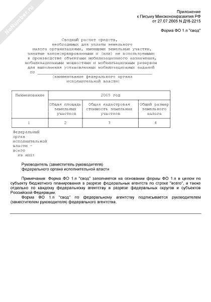 Сводный расчет средств, необходимых для уплаты земельного налога организациями, имеющими земельные участки, занятые законсервированными и (или) не используемыми в производстве объектами мобилизационного назначения, мобилизационными мощностями и мобилизационным резервом для выполнения установленных мобилизационных заданий. Форма № ФО 1.N «СВОД»