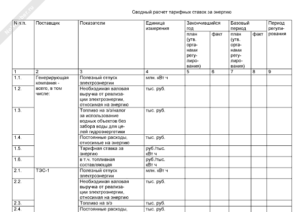 Сводный расчет тарифных ставок за энергию. Форма № 31