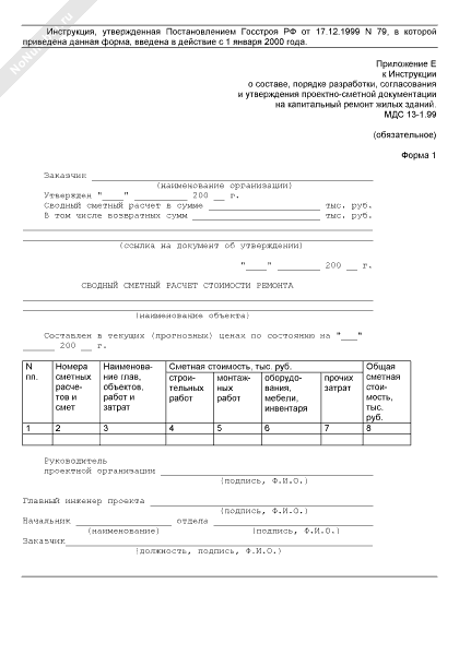 Сводный сметный расчет стоимости ремонта жилого здания (форма № 1)