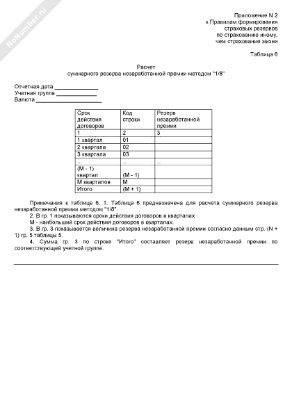 Таблицы для расчета страховых резервов по страхованию иному, чем страхование жизни. Расчет суммарного резерва незаработанной премии методом «1/8» (рекомендуемый образец заполнения)