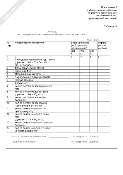 - 9Материалы, представляемые для рассмотрения регулирующим органом вопросов об утверждении (пересмотре) розничных цен на сжиженный газ, реализуемый населению для бытовых нужд. расходы на содержание аварийно-диспетчерской службы (таблица 11)