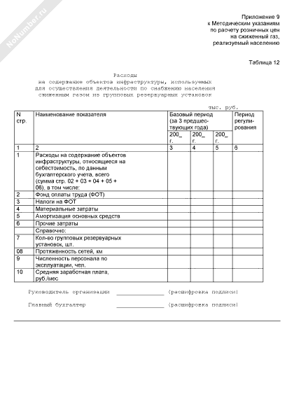 - 10Материалы, представляемые для рассмотрения регулирующим органом вопросов об утверждении (пересмотре) розничных цен на сжиженный газ, реализуемый населению для бытовых нужд. расходы на содержание объектов инфраструктуры, используемых для осуществления деятельности по снабжению населения сжиженным газом из групповых резервуарных установок (таблица 12)