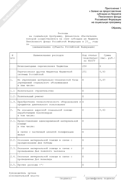 - 40Расходы на социальную программу, финансовое обеспечение которой осуществляется за счет субсидии из бюджета Пенсионного фонда Российской Федерации (приложение к заявке на предоставление субсидии из бюджета Пенсионного фонда Российской Федерации на социальную программу)