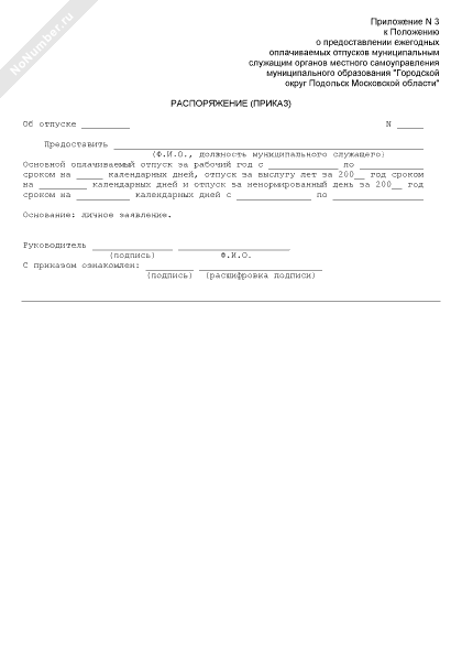- 18Распоряжение (приказ) о предоставлении оплачиваемого отпуска муниципальному служащему органов местного самоуправления муниципального образования «Городской округ Подольск Московской области»