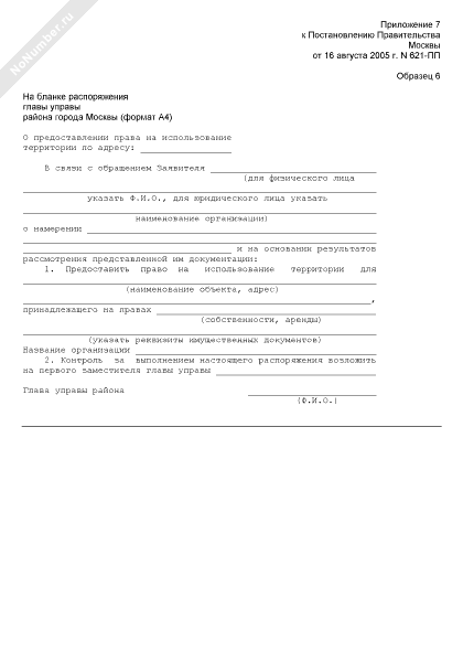 Распоряжение главы управы района о предоставлении права на использование территории (рекомендуемый образец заполнения)