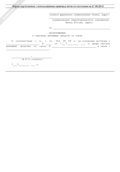 Распоряжение клиента банку о списании денежных средств со счета по требованию третьих лиц (рекомендуемый образец заполнения)