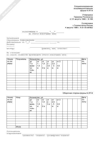Распоряжение на отпуск новогодних елок. Специализированная внутриведомственная форма № ЛП-9 (рекомендуемый образец заполнения)