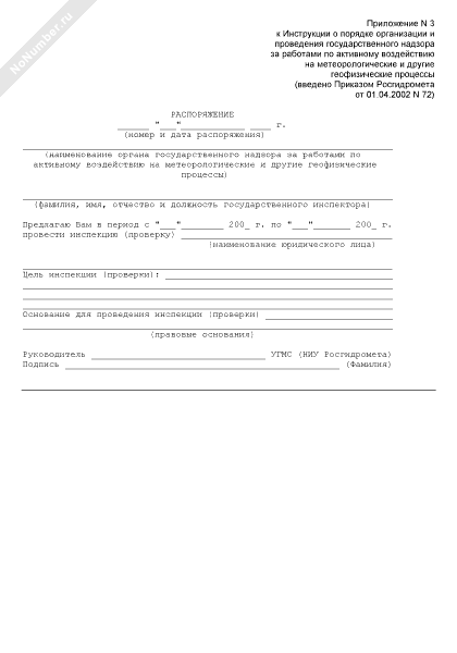Распоряжение на проведение инспекции (проверки) работ по активному воздействию на метеорологические и другие геофизические процессы