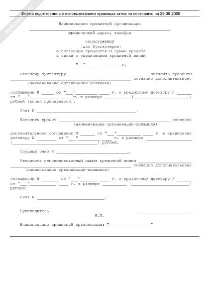 Распоряжение о погашении процентов и суммы кредита с увеличением кредитной линии по кредитному договору (для бухгалтерии)