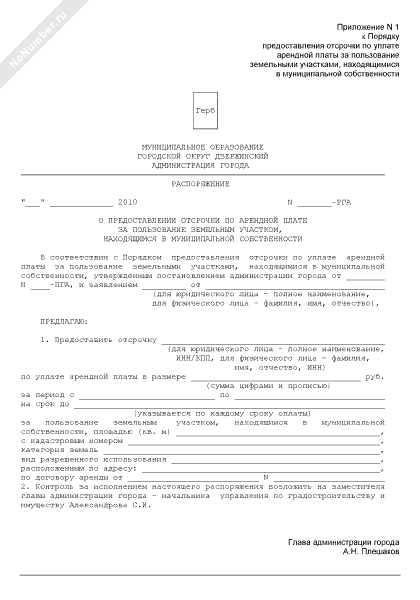 Распоряжение о предоставлении отсрочки по арендной плате за пользование земельным участком, находящимся в муниципальной собственности городского округа Дзержинский Московской области (рекомендуемый образец заполнения)