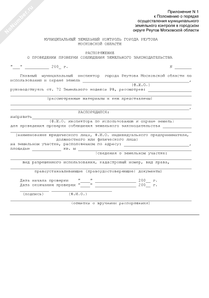Распоряжение о проведении плановой проверки соблюдения земельного законодательства в городском округе Реутов Московской области (рекомендуемый образец заполнения)